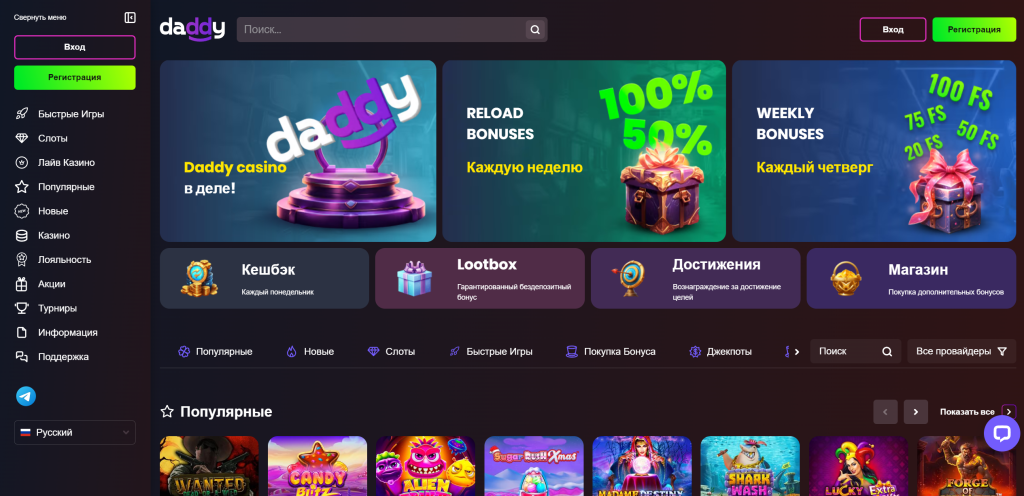 Daddy – известное казино с автоматами, рулеткой и live-играми. На платформе гарантируется честная и безопасная игра. Ознакомьтесь с клубом и его плюсами на практике – создайте профиль и начните делать ставки.